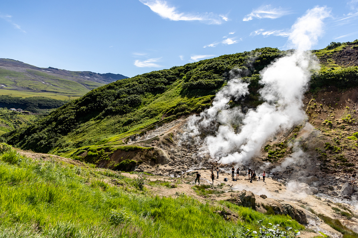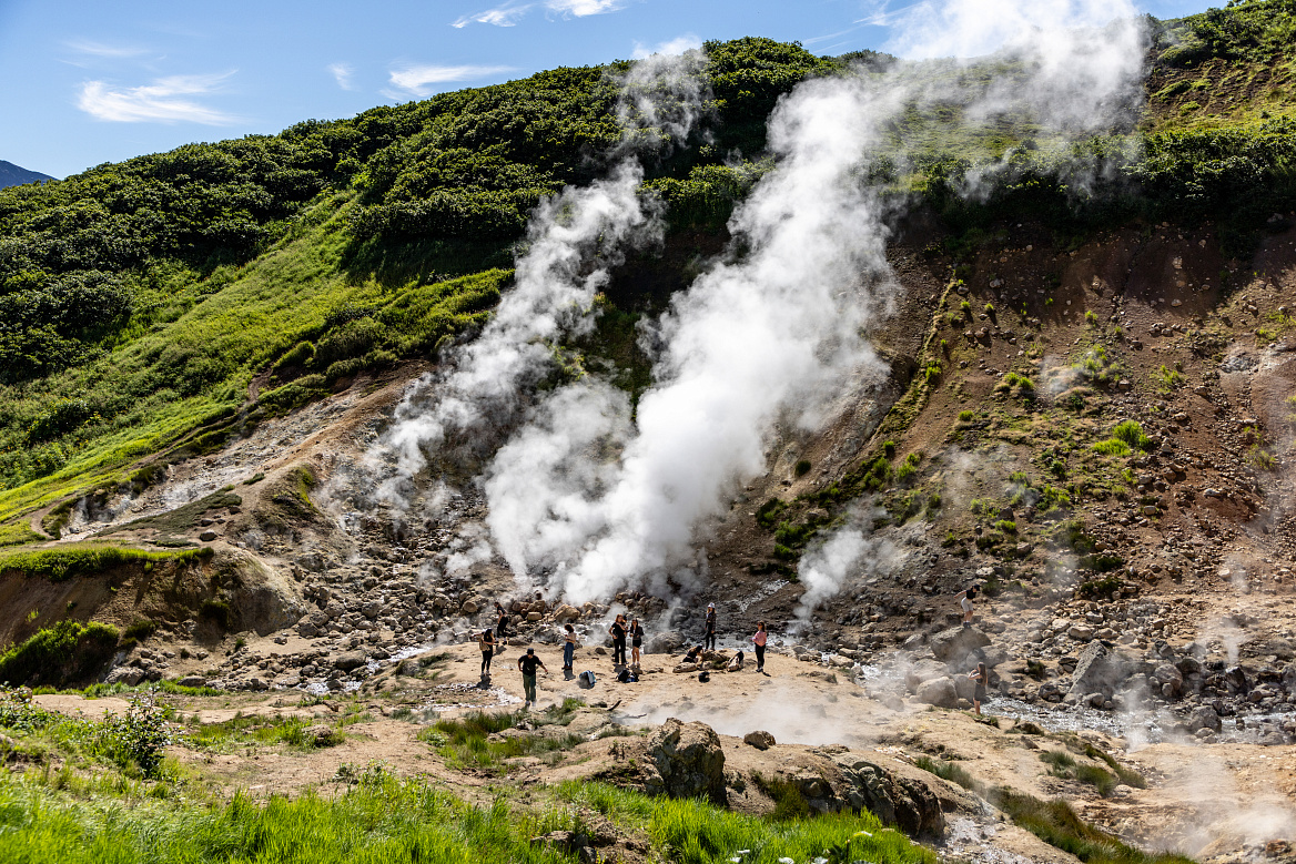Финальной точкой маршрута станет термальная зона Дачных горячих источников. Это уникальное место с кипящими водяными котлами, грохочущими паровыми выбросами и ярко окрашенными минералами.